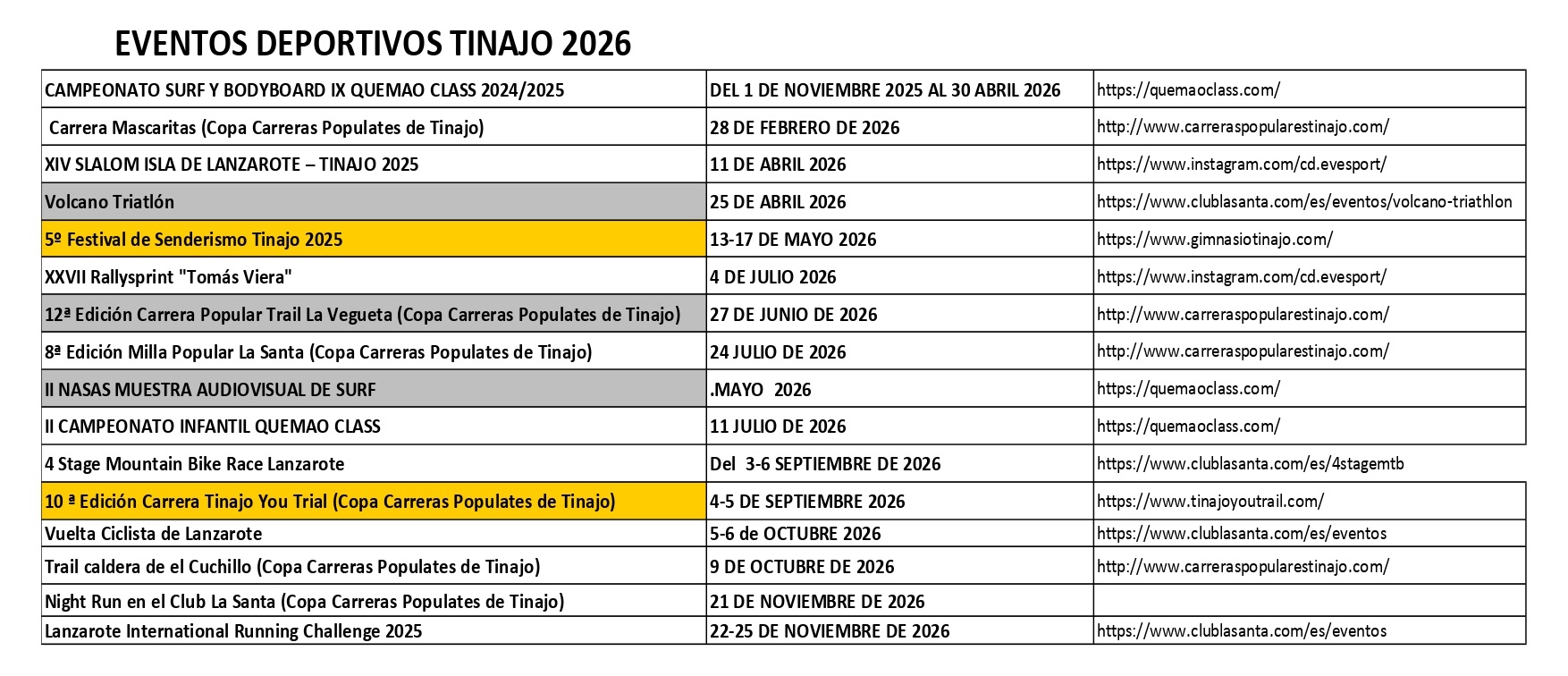 El año 2026 el deporte será protagonista en Tinajo, destacando eventos como la Tinajo You Trail, la quinta edición del Festival de Senderismo de Tinajo, el Quemao Class o, entre las pruebas que organiza Club La Santa, la Vuelta Ciclista de Lanzarote o la Stage MTB Race, entre otras.