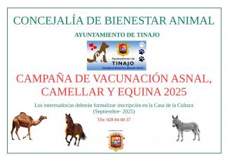 CAMPAÑA DE VACUNACIÓN: ASNAL, CAMELLAR Y EQUINA. La Concejalía de Bienestar Animal del Ayuntamiento de Tinajo, organiza una campaña de vacunación Asnal, Camellar y Equina durante el mes de septiem