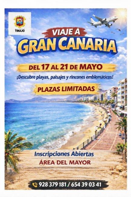 El alcalde de Tinajo, Jesús Machín, y la concejal Delegada de Tercera Edad, Macarena Olivero, informan de un nuevo viaje para nuestros mayores a Gran Canaria, del 17 al 21 de mayo, con plazas limitadas e inscripciones en el Área del Mayor.