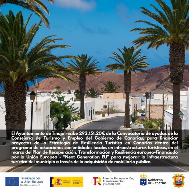 El Ayuntamiento de Tinajo informa que recibe 292.151,20 € de la Convocatoria de ayudas de la Consejería de Turismo y Empleo del Gobierno de Canarias, para financiar proyectos de la Estrategia de Resiliencia Turística en Canarias dentro del programa de actuaciones con entidades locales en infraestructuras turísticas, en el marco del Plan de Recuperación, Transformación y resiliencia europeo, financiado por la Unión Europea “Next Generation EU” para mejorar la infraestructura turística del municipio a través de la adquisición de mobiliario público.