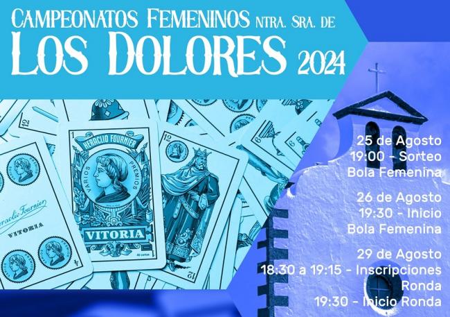 El Ayuntamiento de Tinajo informa que los Campeonatos Femeninos en las Fiestas de Nuestra Señora de los Dolores 2024 se desarrollarán en el Centro Sociocultural de Mancha Blanca del 25 de agosto al 1 de septiembre con premios para primeros y segundos puestos.