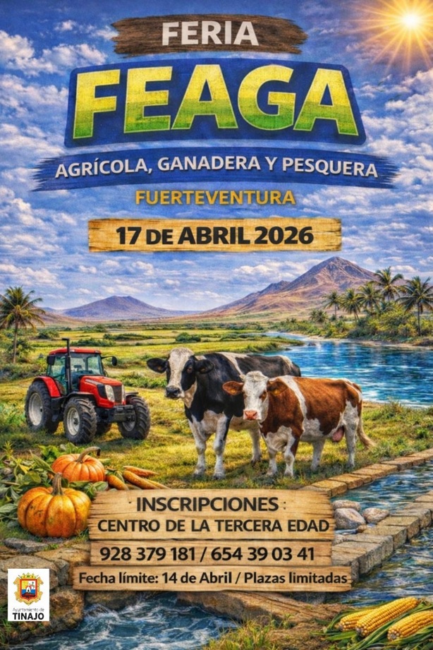 El alcalde de Tinajo, Jesús Machín, y la Concejala Delegada de Tercera Edad, Macarena Olivero, informan que ya está abierto el plazo para el tradicional viaje de nuestros mayores a la Feria Agrícola, Ganadera y Pesquera  de Fuerteventura, FEAGA, previsto para el 17 de abril de 2026.