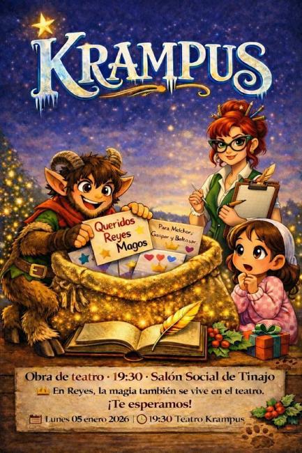 El Ayuntamiento de Tinajo informa que el próximo 5 de enero, a las 19:30 horas, el Salón Social de Tinajo será el escenario para “Krampus”, una obra de teatro diferente y sorprendente.