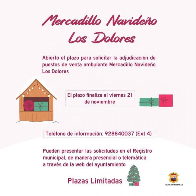 La Concejalía de Cultura del Ayuntamiento de Tinajo recuerda que ya está abierto el plazo para solicitar la adjudicación de puestos de venta ambulante en el Mercadillo Navideño de Tinajo en Los Dolores que tendrá lugar los domingos de diciembre, los días 7, 14, 21 y 28 diciembre. Plazas limitadas.