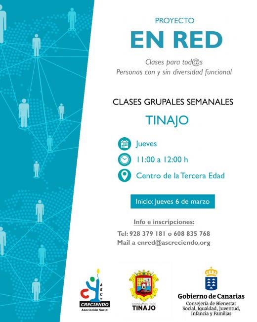 El Ayuntamiento de Tinajo informa de la puesta en marcha del “Proyecto en red” que ofrece clases grupales semanales los jueves, a partir del 6 de marzo, de 11:00 a 12:00 horas, en el Centro de la Tercera Edad.