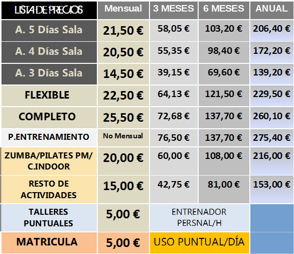 Los abonos de los que disponemos pretenden encortar tu oferta a medida. Disponemos de abonos de Sala en los que puedes elegir el númere de días de entrenamiento y que incluyen: