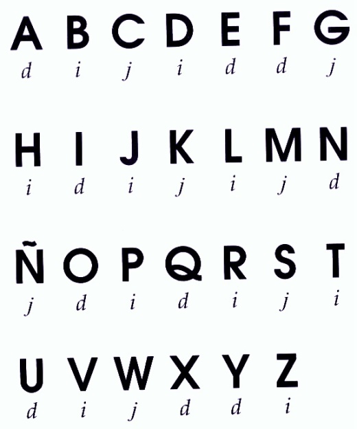 Te proponemos un juego de concentración, coordinación y atención. Se trata de recitar el abecedario en voz alta a la vez que levantamos las manos según nos indique la letra que aparecdebajo de cada una de las letras que integran el mismo. Si aparec "d" levantamos mano derecha, si aparec "i" mano izquierda y si aparec "j" ambas manos. ¿Te atreves?