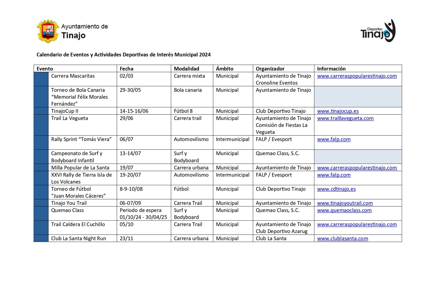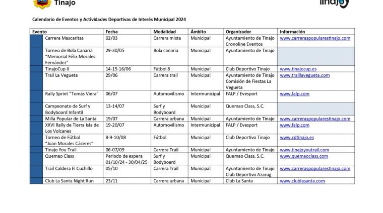 La Concejalía de Deportes del Ayuntamiento de Tinajo les presenta el calendario de actividades deportivas que se celebrarán en el municipio en este 2024. Además