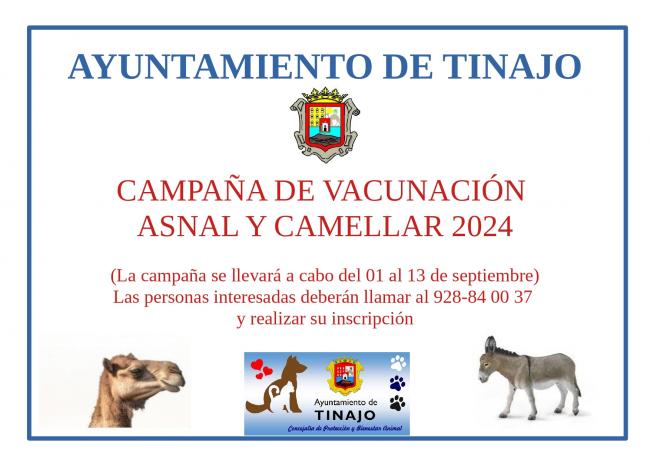 El Ayuntamiento de Tinajo a través de la Concejalía de Bienestar Animal, pone en marcha nuevamente la Campaña de Vacunación Asnal y Camellar del 01 al 13 de septiembre de 2024.