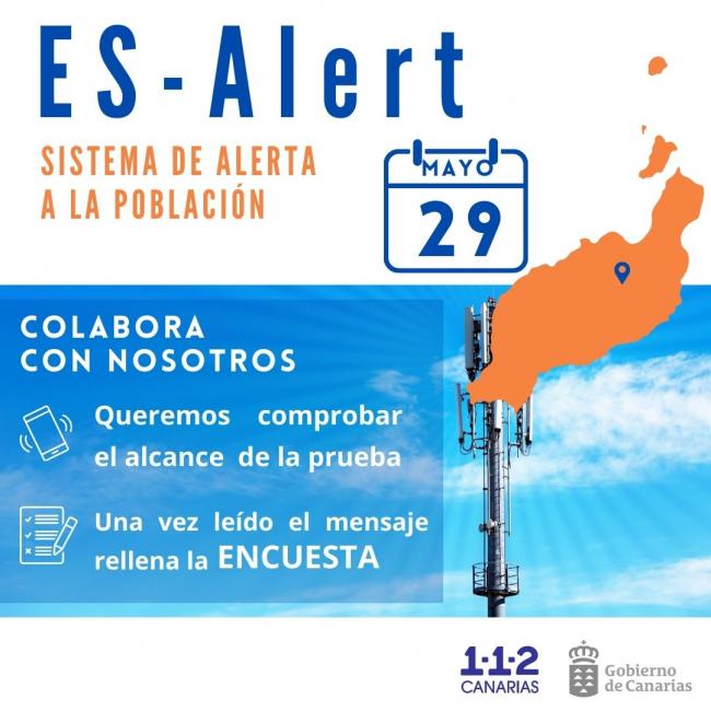 El Ayuntamiento de Tinajo informa sobre la celebración el próximo miércoles, 29 de mayo, en Lanzarote, de una nueva prueba del sistema de aviso a la población en caso de emergencia, denominado ES-Alert, organizada por el Gobierno de Canarias, a través de la Dirección General de Emergencias y el Centro Coordinador de Emergencias y Seguridad (CECOES) 112, en colaboración con el Cabildo de Lanzarote y todos los ayuntamientos de la isla y la Dirección General de Protección Civil del Estado.