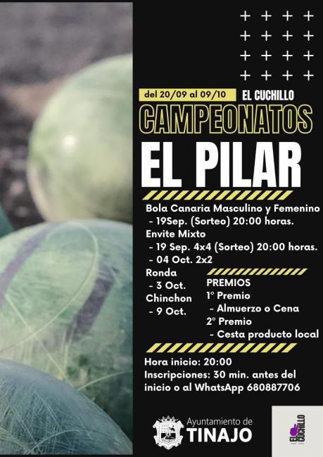 El Ayuntamiento de Tinajo informa que, del 20 de septiembre al 9 de octubre, se celebrarán los Campeonatos Nuestra Señora Del Pilar, enmarcados en las Fiestas de El Cuchillo, de Bola Canaria, Envite Mixto, Ronda y Chinchón.