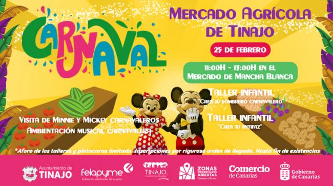 El Ayuntamiento de Tinajo, con la colaboración de Felapyme y el Gobierno de Canarias, organiza la celebración del Carnaval en el Mercado Agrícola de Tinajo el próximo Domingo, 25 de febrero con talleres y pintacaras infantiles, la visita de Minnie y Mickey carnavaleros contando todo ello con ambientación musical carnavalera.
