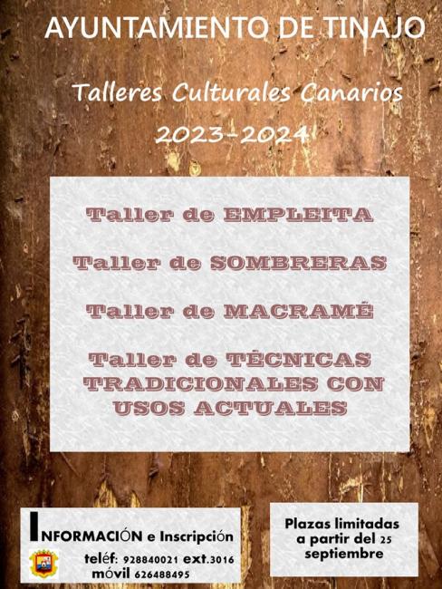 La concejalía de Cultura del Ayuntamiento de Tinajo que dirige Yurena Cubas informa sobre la celebración de “Talleres Culturales Canarios 2023-2024” que ofrecerán las siguientes opciones: