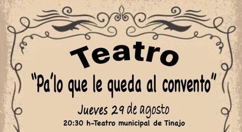El Ayuntamiento de Tinajo informa que retorna a la agenda cultural del municipio el próximo jueves, 29 de agosto, a las 20:30 horas, en el Teatro Municipal, la obra “Pa’lo que le queda al convento”, obra con un toque solidario que estaba prevista en las Fiestas de San Roque y se tuvo que aplazar.