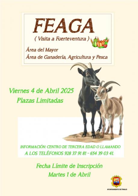 El Concejal Delegado de Agricultura, Ganadería y Pesca, Luis Pérez Berriel, y la Concejala Delegada de Tercera Edad del Ayuntamiento de Tinajo, Macarena Olivero, informan del viaje del próximo viernes, 4 de abril, a FEAGA (Fuerteventura). Viaje para todas las edades con plazas limitadas y con fecha límite de inscripción el martes, 1 de abril.
